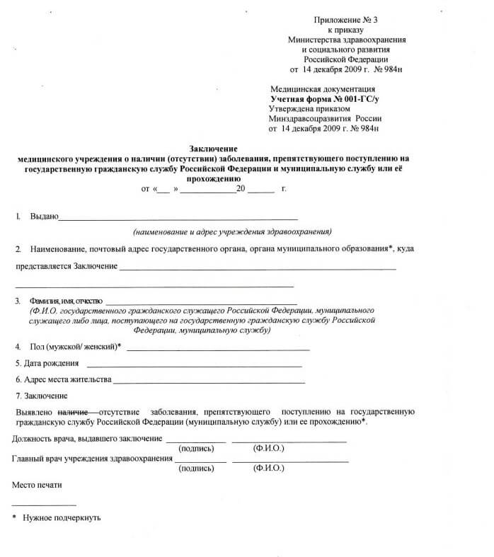 Медсправка по форме 001 ГС/У необходима поступающим на госслужбу. Любой сотрудник госорганов обязан обладать стрессоустойчивостью, не поддаваться панике, уметь принимать взвешенные решения. Ему придется проходить осмотр несколькими специалистами, получать соответствующее медицинское заключение. В документе указываются сведения, подтверждающие психическое здоровье гражданина.