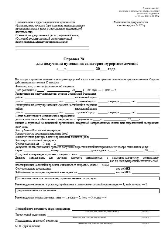 Справка 070у для получения путевки в санаторий считается действительной, если в ней нет помарок и исправлений, а вся информация написана разборчивым почерком. Основной диагноз должен дублироваться кодом по МКБ-10.